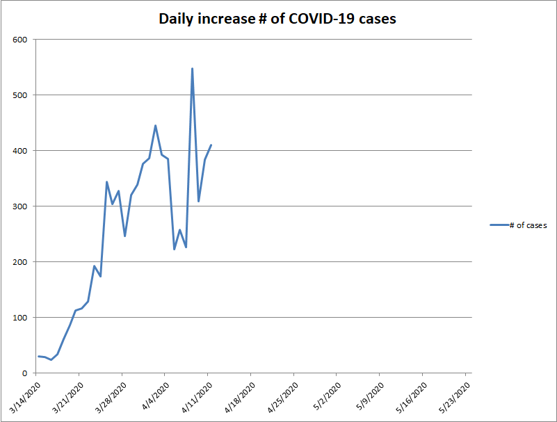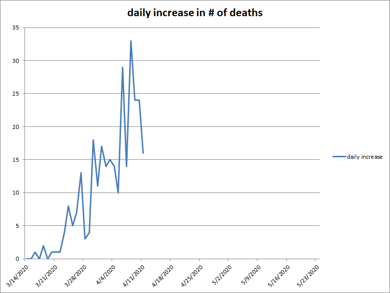- The number of tests is back up to about 2000 per day. That’s still way too low, but it’s at least moving in the right direction again.