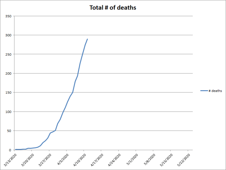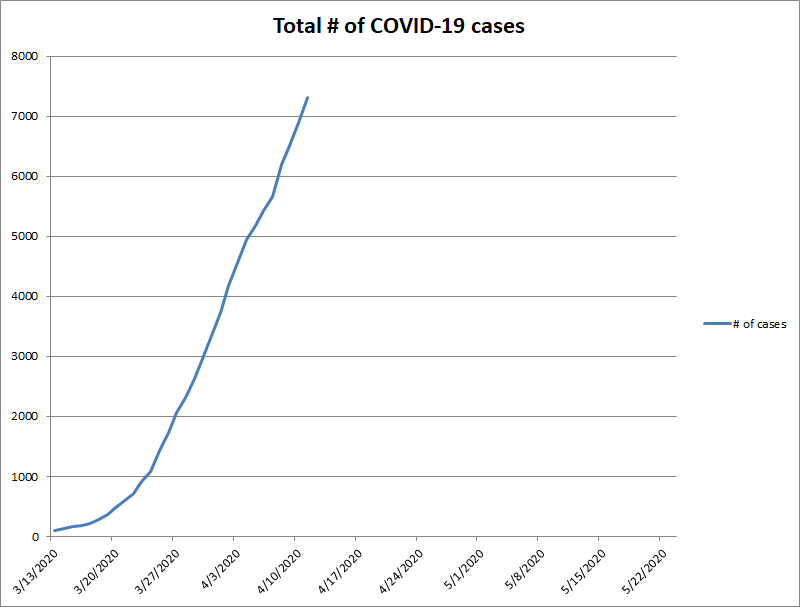 The graphs and data presented below use the raw summary data as provided by the Colorado Department of Public Health and the Environment (CDPHE) every day at 4 PM. The data is subject to revision, but I haven’t taken the time to dive into it and make corrections. And to their credit, neither has the CDPHE. They’re a little busy with other things, like keeping us all healthy. The model I use is a simple doubling model that doesn’t (yet) account for social distancing effect that are likely already having an impact on the number of cases. As such it will overestimate the number of cases and deaths. So consider any projections based on my model as the worst possible case that could happen given the data from 3/13 when I started tracking COVID-19 in Colorado through today. And as always, I’m not an epidemiologist. If anything an actual public health expert says (No, that does not include Fox News, OANN, or the President of the United States, or anyone docsplaining) contradicts what I say below, listen to them first.