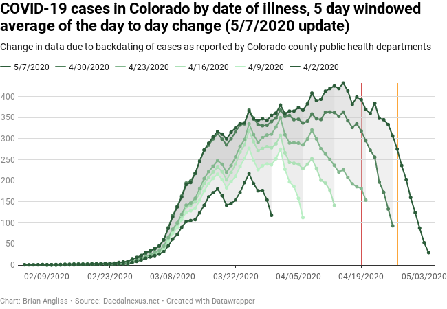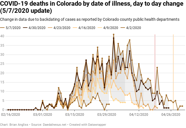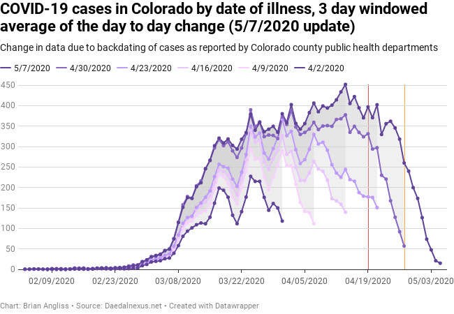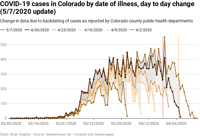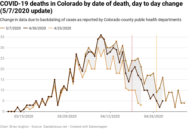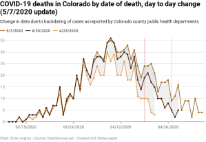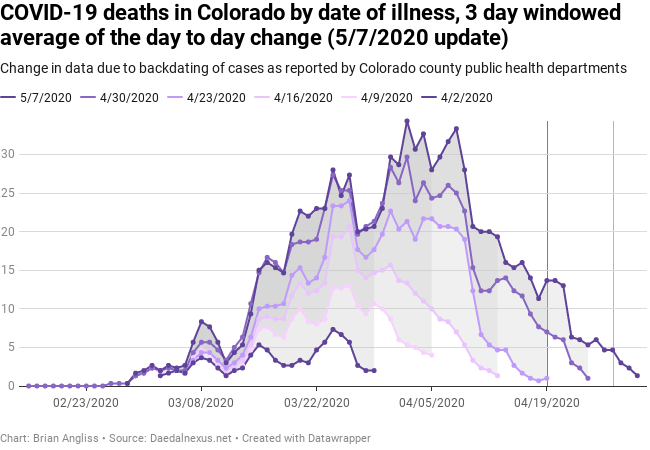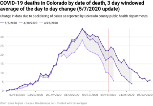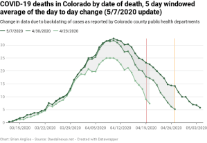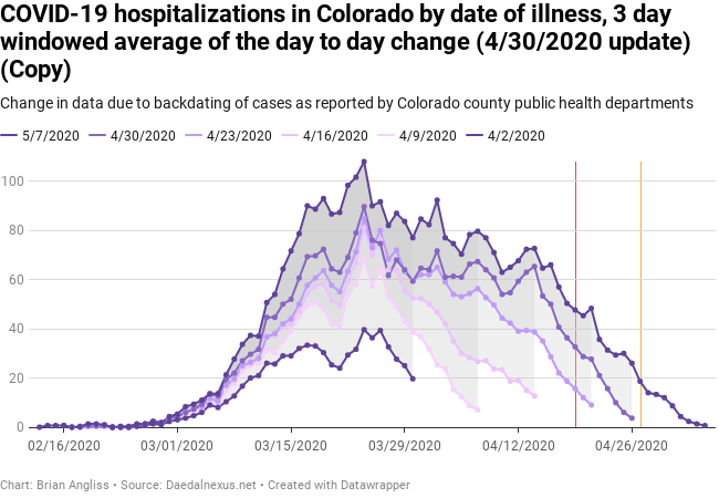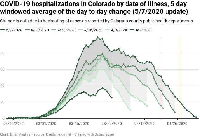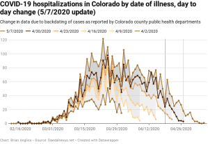 I’ve highlighted a couple of key dates to the graphs this week: April 19 (red line) and April 27 (orange line). April 19 was the day that Operation Gridlock hit Denver and there were anti-stay-at-home protests. April 27 was when Governor Polis started to relax the statewide stay-at-home order to “safer-at-home.” If either event is linked to an increase in the daily number of cases, hospitalizations, or deaths, we should start to see indications of that in the data.