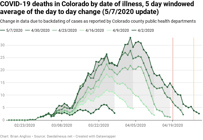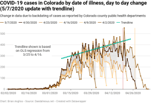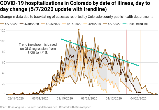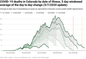 Now let’s look at Colorado’s daily hospitalizations by date of illness onset. Unlike the daily cases data discussed above, the daily hospitalizations data shows signs of slowing. But as we can see from the peak on April 20, there may be indications that a spike in infections may be occurring following the anti-lockdown protests that happened on April 19. The problem is that there’s so much variability from one day to the next that it’ll be at least another week before we know for sure.
