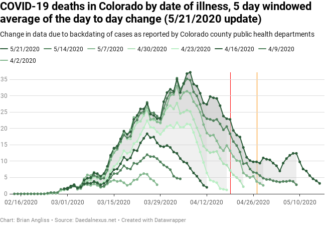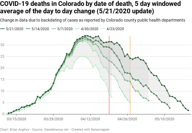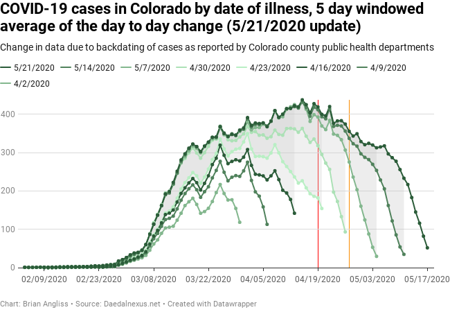 The same two bumps in cases exist in the 5-day windowed data (bottom right) as well, and there’s a spike April 22 that wouldn’t need too many more adjustments to become the new maximum number of cases. But the trend is starting to look better, with an apparent reduction in the number of cases. Next week will tell us a lot more about whether or not we saw a reduction in cases up to Polis’ end of the lockdown or whether the number of cases continues to trend downward.