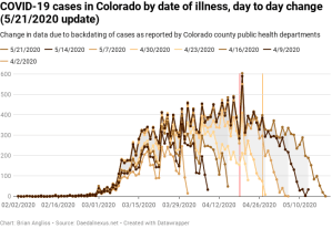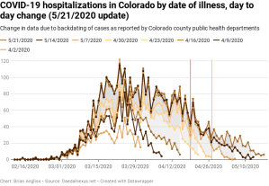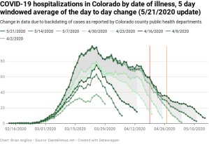 The question is whether Polis’ and local county’s continued relaxation of restrictions (such as Douglas County’s reopening of restaurants and the Park Meadows Mall on May 23) is going to result in a completely flat or even slow increase in new hospitalizations. I’m going to go a little out on a limb and project that, based on what the data is showing, we’re going to see the number of new hospitalizations flatten and start to increase again over the few weeks.