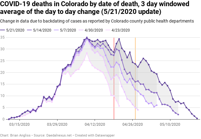 So it’s much more useful to look at the 3-day windowed data instead (middle right). And here we see some features. For example, there is a small hump in cases on April 26, six days after the anti-lockdown protests. And there’s another small hump about five days after Polis ended the statewide lockdown.