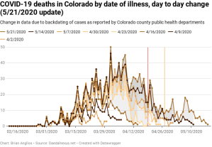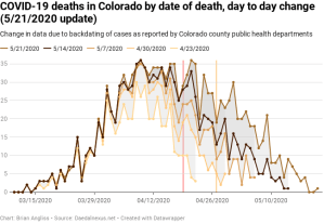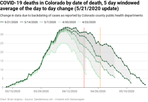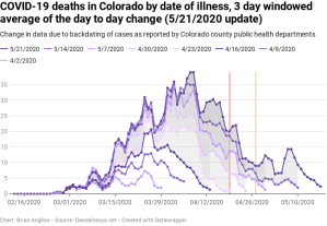 Third there are two large spikes in new deaths on May 1 and May 7. The one on May 1 could be related to people rushing out after Polis’ stay-at-home order was relaxed, but it doesn’t have to be. But there’s nothing specific that I could find that might be connected to the May 7 spike. My guess is that it’s due to an outbreak in a care facility or two, but it could also be tied to one or more counties reopening prematurely. I haven’t take the time to dig into the data deep enough to say one way or another.