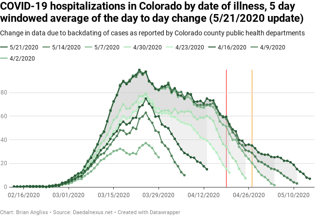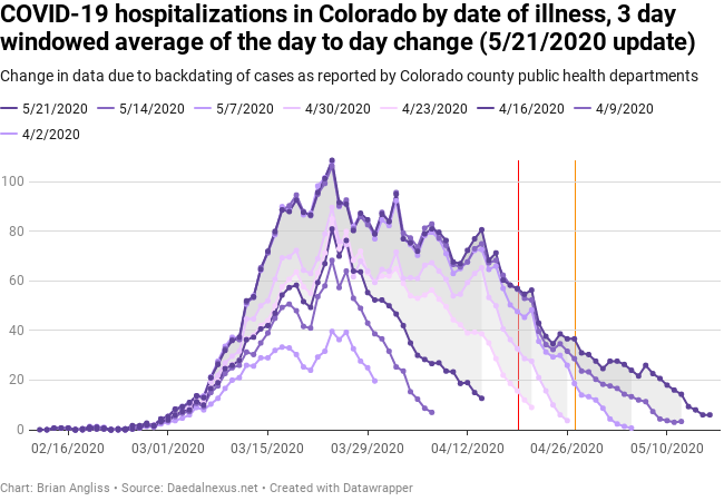 The 3-day windowed data largely erases the big single-day spike on April 20, but we’re seeing a secondary spike around April 23 and 24 continue to slowly rise up. This spike could be an artifact, but it’s also potentially related to the anti-lockdown protests. And there’s a spike starting to form around May 5, which would be about a week after Governor Polis relaxed statewide restrictions from “stay-at-home” to “safer-at-home.” We should keep an eye on both of those over the next week or two and also look to see if there’s any corresponding increases in hospitalizations and/or deaths.