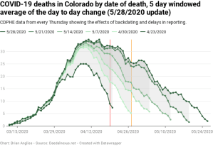 For a larger image, click the figure. For a larger, interactive image, click hereFrom the number of deaths by date of death (right), we can see that last week’s small lump around May 1 has turned into a much larger lump. This is at about the earliest we could expect to see impacts from the April 19 anti-lockdown protests, but it could be due to something else entirely. The larger concern is that we’re seeing signs of a slowdown in deaths by date of death just as we are deaths by date of illness onset. From about May 12 onward we see that the sharp decline in deaths has started to flatten out. I would expect it to flatten to roughly match, on average, the deaths by illness onset.
