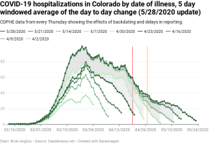 As with the new cases, 20-30 new hospitalizations a day is probably few enough that the hospitals can plan for it effectively. But it still adds up to a lot of people getting very sick. And as with the number of cases, hospitalizations are not likely to simply hover between 20 and 30. With the relaxation of restrictions in Colorado, hospitalizations are going to start going up again.