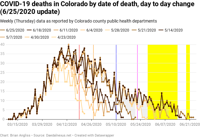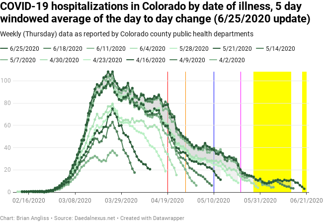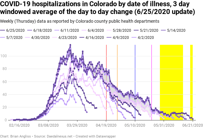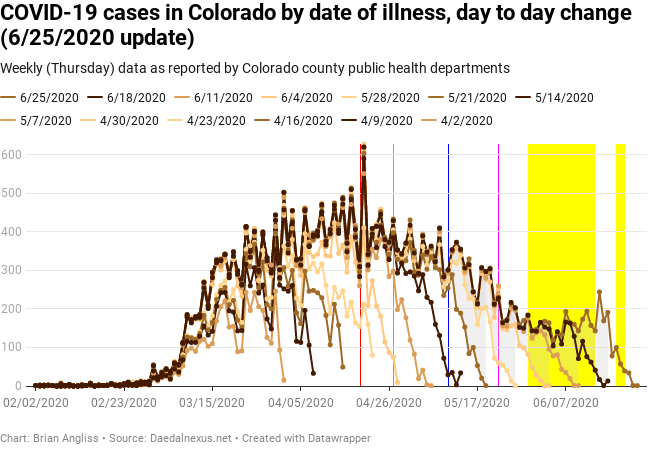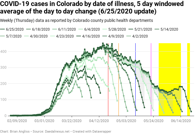 Since my last COVID-19 assessment, I’ve added two more highlighted dates and two date ranges. The red and orange lines remain the April 19, 2020 anti-lockdown protests in Denver and the day that Governor Polis relaxed the statewide stay-at-home order (although many counties continued to impose stay-at-home orders that expired a couple of weeks later). The blue line is Mother’s Day, the magenta line is the end of school for most children across colorado, and the yellow date ranges are the George Floyd/Black Lives Matter (BLM) protests that have been happening in Colorado.