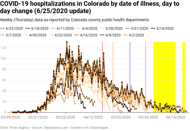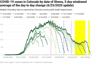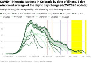 So let’s summarize. New COVID-19 cases are increasing again, and primarily among late teens and early twentysomethings (whose brains tend to be wired for reward over risk). There are indications that the anti-lockdown protests might have created bumps in cases, indications that Polis’ relaxation of the statewide lockdown slowed the decline in all the COVID-19 metrics (new cases, new hospitalizations, and new deaths), and indications that the BLM protests have spread COVID-19 some (but probably not as much as indoor gatherings).