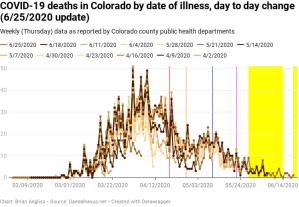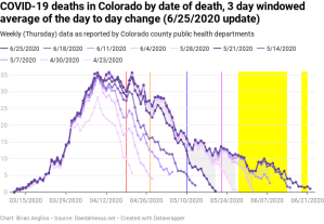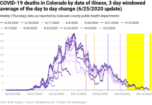 Similarly, we see the decline in the number of deaths per day slow down on around May 10, which is about two weeks after Governor Polis relaxed his stay-at-home order to a safer-at-home order. That doesn’t mean they’re connected, but the data indicates that there could be a correlation that is also causative. But again, we can’t say.
