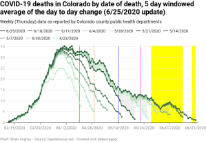 Since about May 10 the data shows a slower decline to more like two deaths per day, but the data is new enough it’s tough to be sure. And with the recent rise in cases and what may become a similar rise in hospitalizations, we can probably expect that the number of deaths will start increasing as well. The lag from contracting COVID-19 to being hospitalized for it to dying of it is weeks, however, so we shouldn’t expect anything significant until the 7/2 or even 7/9 datasets.