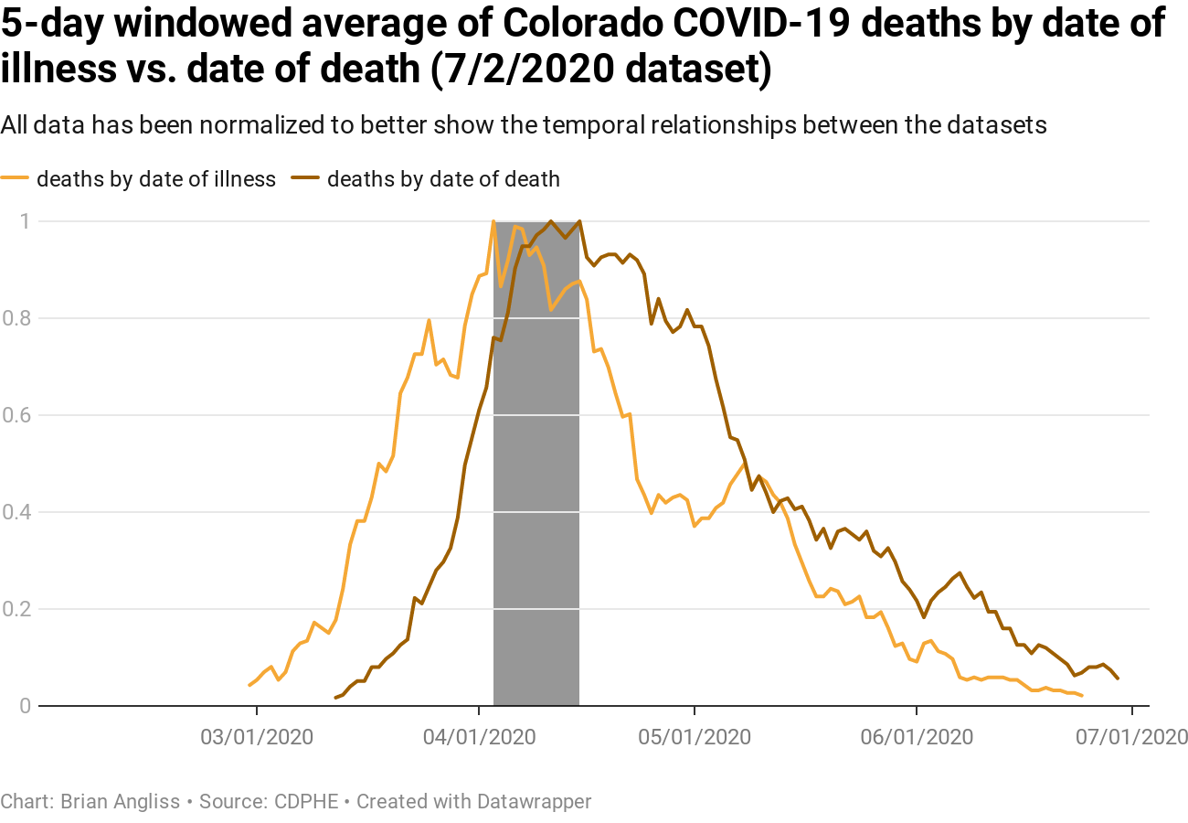 The third chart (bottom right) shows the 5-day windowed average of hospitalizations by date of illness compared to deaths by date of death, again normalized to emphasize the temporal relationship. If we look at the gray highlighted region, you see that we can use the peaks to estimate the delay between when someone shows symptoms of COVID-19 to the point at which they die from it. Just going from peak to peak shows a range of 17-23 days.
