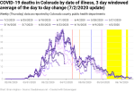 The first chart (top right) shows the 5-day windowed average of the cases, hospitalizations, and deaths by illness offset. The chart has been normalized in order to focus on the temporal relationships between the three curves. The graph shows that the hospitalizations and cases track each other when they’re measured by date of illness, as we would expect. It also shows how the imposition of various anti-pandemic measures by Governor Polis changed both the rate of growth in cases and simultaneously changed the rate of growth in hospitalizations. The graph shows that there is a delay of about 8 days from rising hospitalizations to a subsequent rise in deaths from COVID-19.
