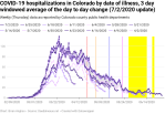 But the cyan highlighted area is the area I want to focus on. It shows how new cases in Colorado are driving increases in new hospitalizations. The relationship is complicated and non-linear and so the simple correlation function (which assumes a linear relationship) is only about 0.5, but the bumps very clearly line up in time, so there is a relationship.