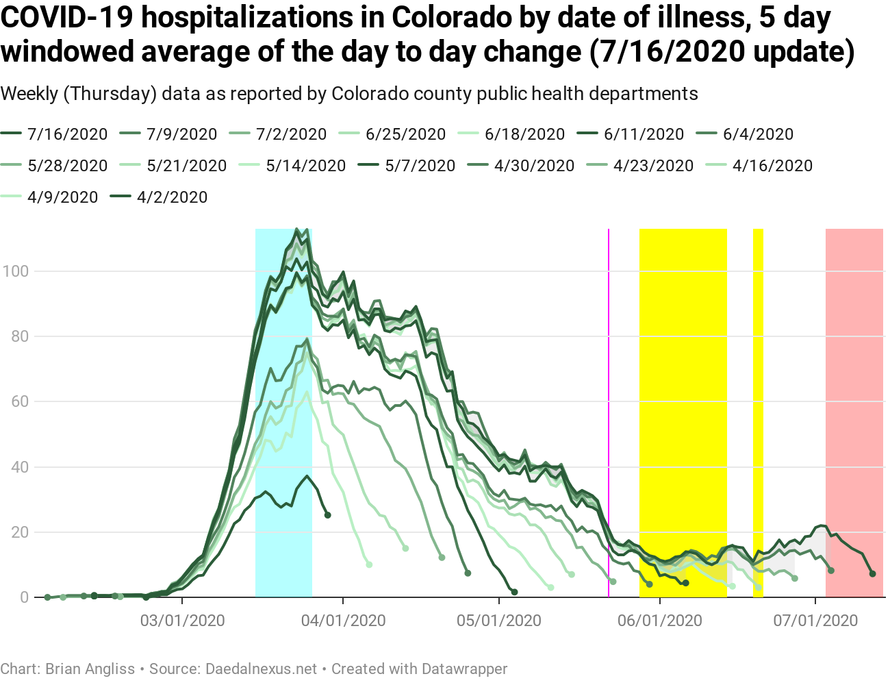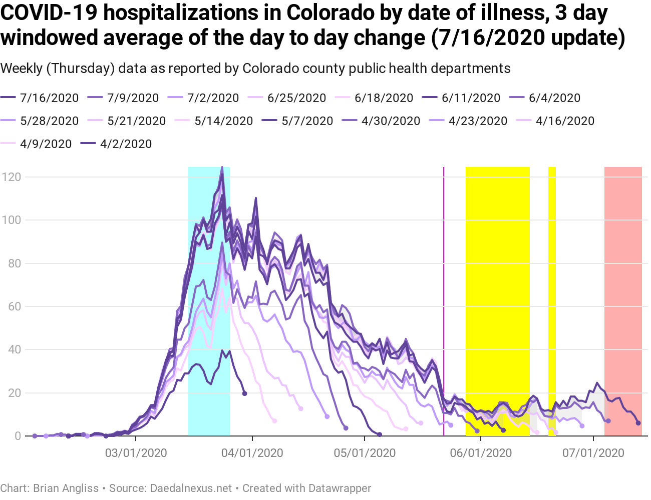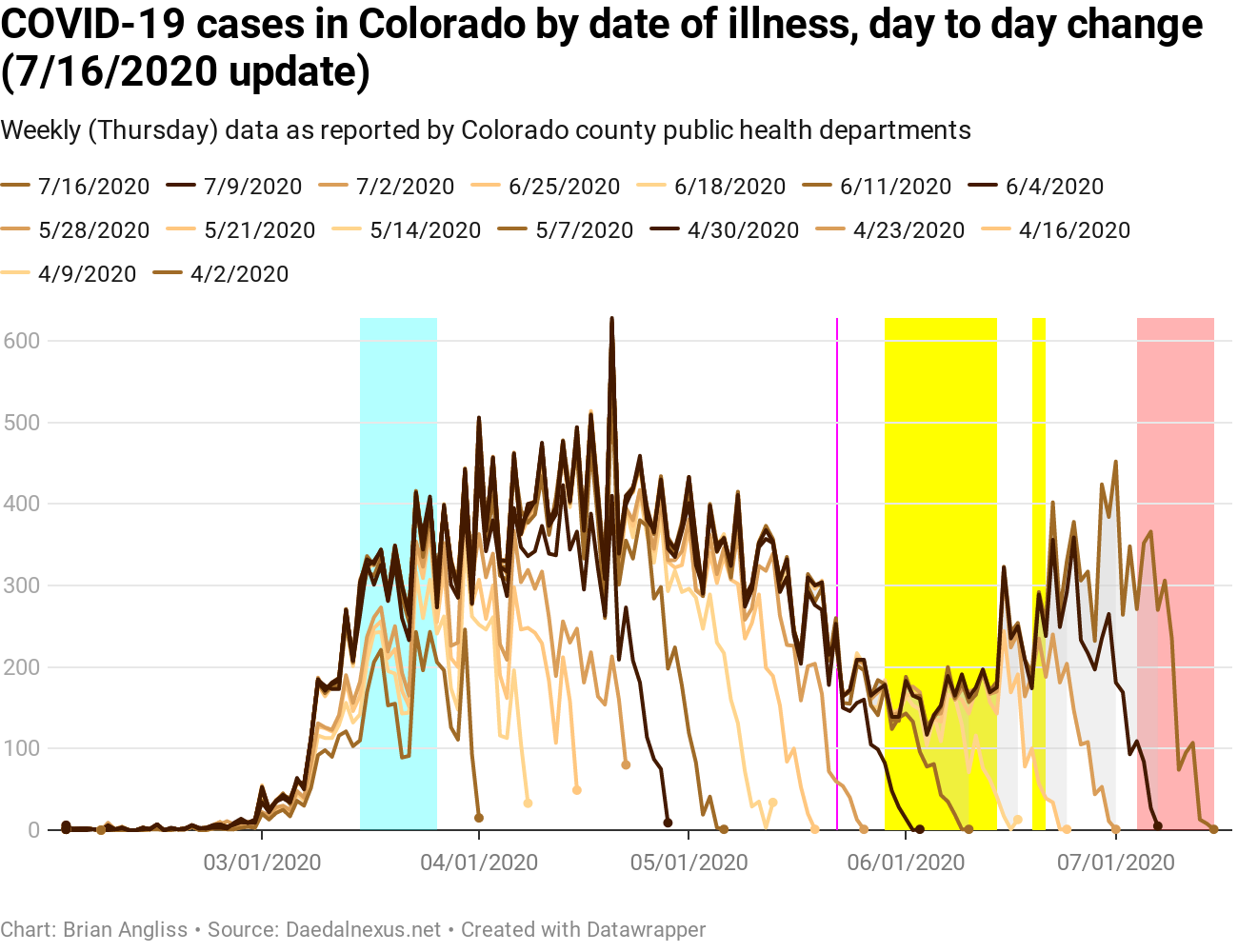 I’ve updated the highlights on the graphs again. Now there are three areas – the cyan area which occurs when Polis was instituting statewide policies to combat the spread of COVID (March 15-26), the yellow area which is when the main BLM protests were happening in Colorado (although smaller protests continue to this day), and the red area that defines the data that is not trustworthy due to reporting lags (back 11 days from the date of the dataset). I’ve also left in the magenta line on May 22, which is the day that most Colorado schools let out for the summer.