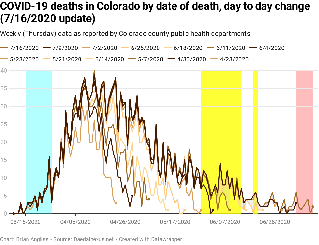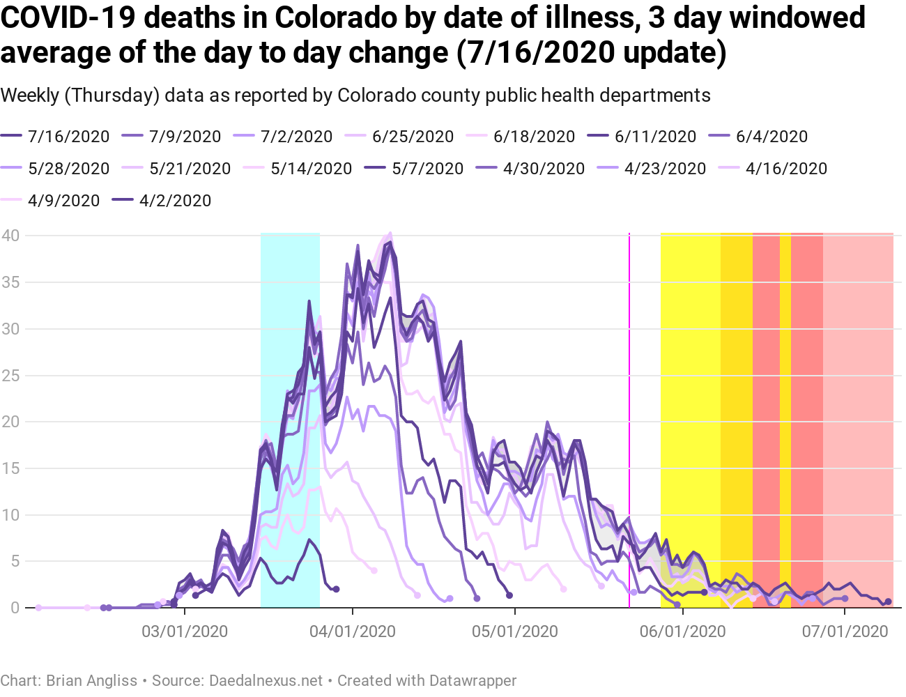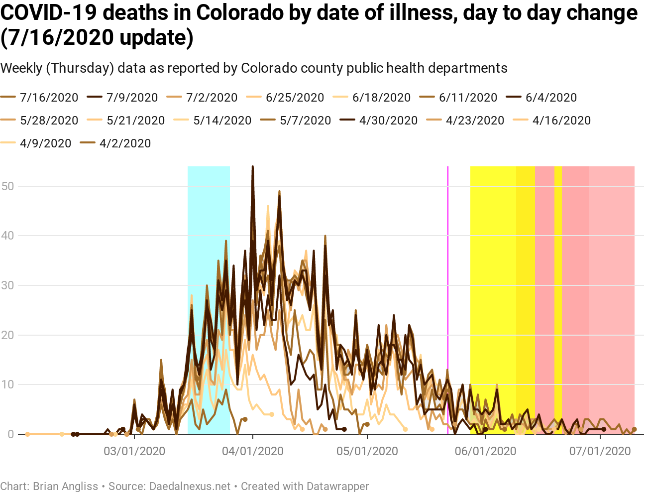 Before I describe what I’m seeing in the new deaths by date of illness data, let me explain the more complicated highlighting in these graphs.