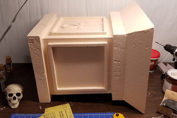 Obelisk stone fully assembled and ready for a spiral crack to be ripped out of itThe last image is the obelisk stone after being fully assembled, patched with lightweight spakle, and sanded smooth with 320 grit sandpaper. It’s now ready for me to mark out a 8′ 3″ long spiral down it’s entire length so I can rip a crack out of it into which I will glue my red electroluminescent (EL) wire from Adafruit (it was a Christmas present from my son – thanks, kiddo!). At the same time I’m going to mark locations for several plastic skulls that I cut the back off and painted a very flat black except for the eye socket and nose so that the EL wire will make the skulls glow faintly red.