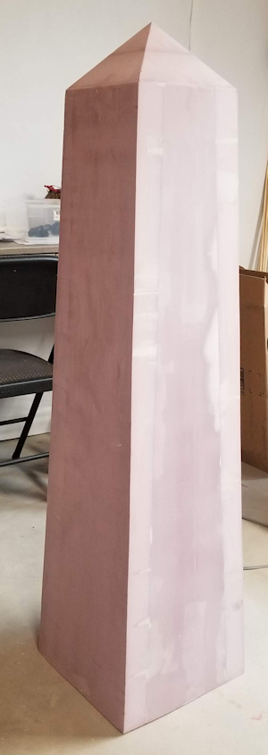 Obelisk base, fully assembled, aged, and texturedI’ve made decent progress on the obelisk since the last time I posted progress. The first image is the obelisk base fully assembled, having been aged with a knife, sandpaper, scissors, and a rasp and textured using a fine orange peel wall texture. It’s ready to be painted with a nice sandstone-looking paint my wife helped pick out.