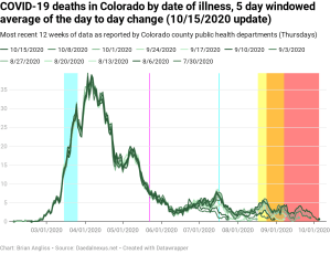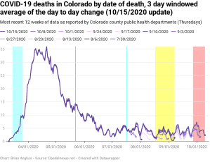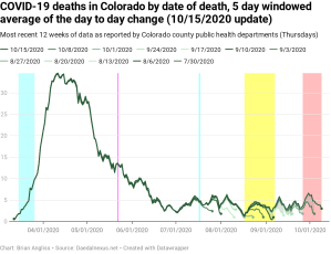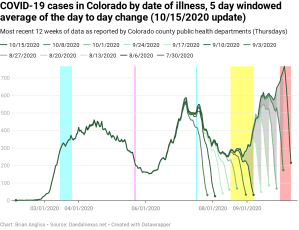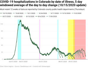 The percentage of positive test results (the number of positive tests divided by the total number of tests) is now up over 5% and, with some hindsight, we can see that it’s been increasing since roughly Labor Day – when most schools in Colorado went back to in-person classes. Given this has exceeded the Colorado Department of Public Health and Environment’s 5% threshold that they use to impose new restrictions, we should expect that a new round of COVID-related restrictions will be coming soon.