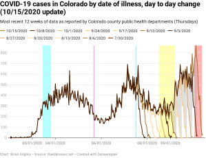 As I said two weeks ago, new cases by date of illness onset increased at the same time that schools went back into session. We can see that from the graphs below (yellow highlighted region). The biggest jump even happened right after Labor Day, when nearly all of Colorado’s school districts went back to in-person (hybrid or full time) teaching. And as kids went back to school, parents went back to work, and pandemic fatigue kicked in, and cases started rising.