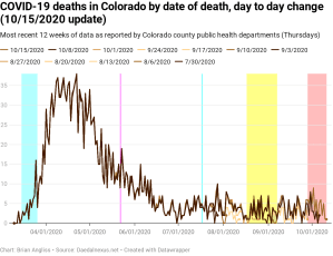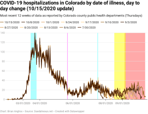 And we can’t neglect to notice that the gray band goes all the way back to early July. That means there are patients dying today who were hospitalized with COVID-19 over three months ago. Not a lot, but some.