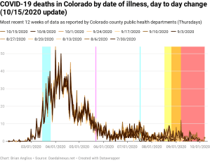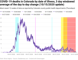 There are still some updates happening all the way back in July, but they’re relatively small. There are larger changes happening in late August, and there are larger updates the closer to the present we get. Unfortunately, the red instability period still overlaps the yellow school transition period, so we’re not yet getting good data on new deaths by date of illness and won’t for several more weeks.