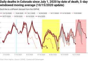 We can see that the gray periods in the deaths by date of death (lower left) go far back all the way back to early July (and thus likely beyond), but that the farther back in time you look, the narrower the gray band is. The narrower the band is, the more stable the data is.