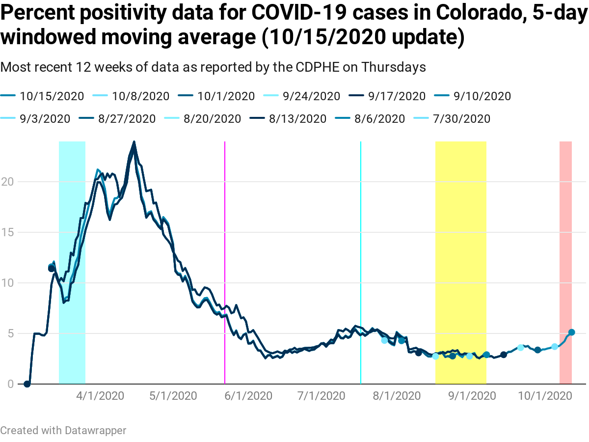 - Cyan line: July 17, the day that Gov. Polis re-institutes a statewide mandatory mask order in response to rising cases of COVID-19 and the test positivity percentage exceeding 5%.