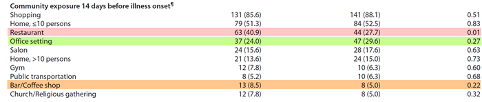 What the authors found was that the 154 COVID-positive study group were more likely to have visited a restaurant (p=0.01) or a bar/coffeeshop indoors (p = 0.22) than the control group. All the other activities – shopping, visiting the gym, going to a salon or barber, and so on – showed little to no statistical difference between the study group and the control group.