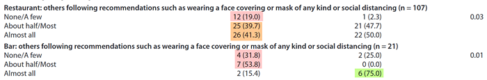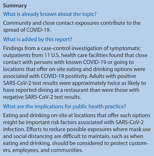 When the authors combined their findings about restaurants with followup questions about whether or not other patrons or employees at those establishments were wearing masks and/or social distancing, the authors found a statistically significant difference. Specifically, the 154 COVID-positive study participants were more likely to have been at restaurants or bars with less masking and/or social distancing than control participants (p=0.03 and p=0.01 respectively).
