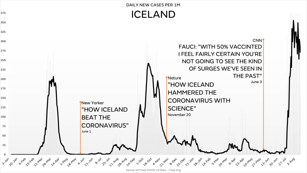 In other graphs created by this same guy, he uses raw count of new cases, sometimes he uses count scaled to 100k population, and sometimes he uses count scaled to 1M population. While the numbers are always correct, the scale variation creates confusion when looking at multiple graphs and encourages viewers to draw the wrong conclusions.With respect to Iceland, the maximum number of recent cases was 170. Again, Florida alone maxed out recently at over 45,000. If we use the more stable 7-day average of new cases per day, Iceland’s news cases are 116 while Florida is over 25,000. Differences like this matter, but the graph’s creator wants you to misunderstand them.